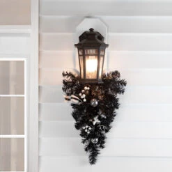 20″ Pre-lit Decorated Black Pine Artificial Teardrop Christmas Swag, Warm White LED Lights