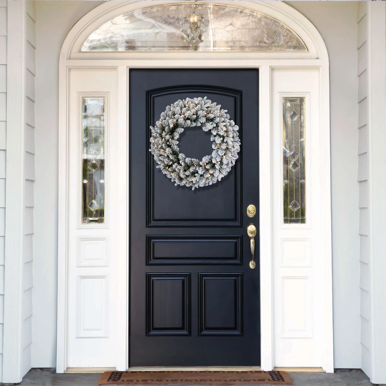 Snow-dusted wreath can be displayed on doors, walls, and windows in indoor or outdoor locations