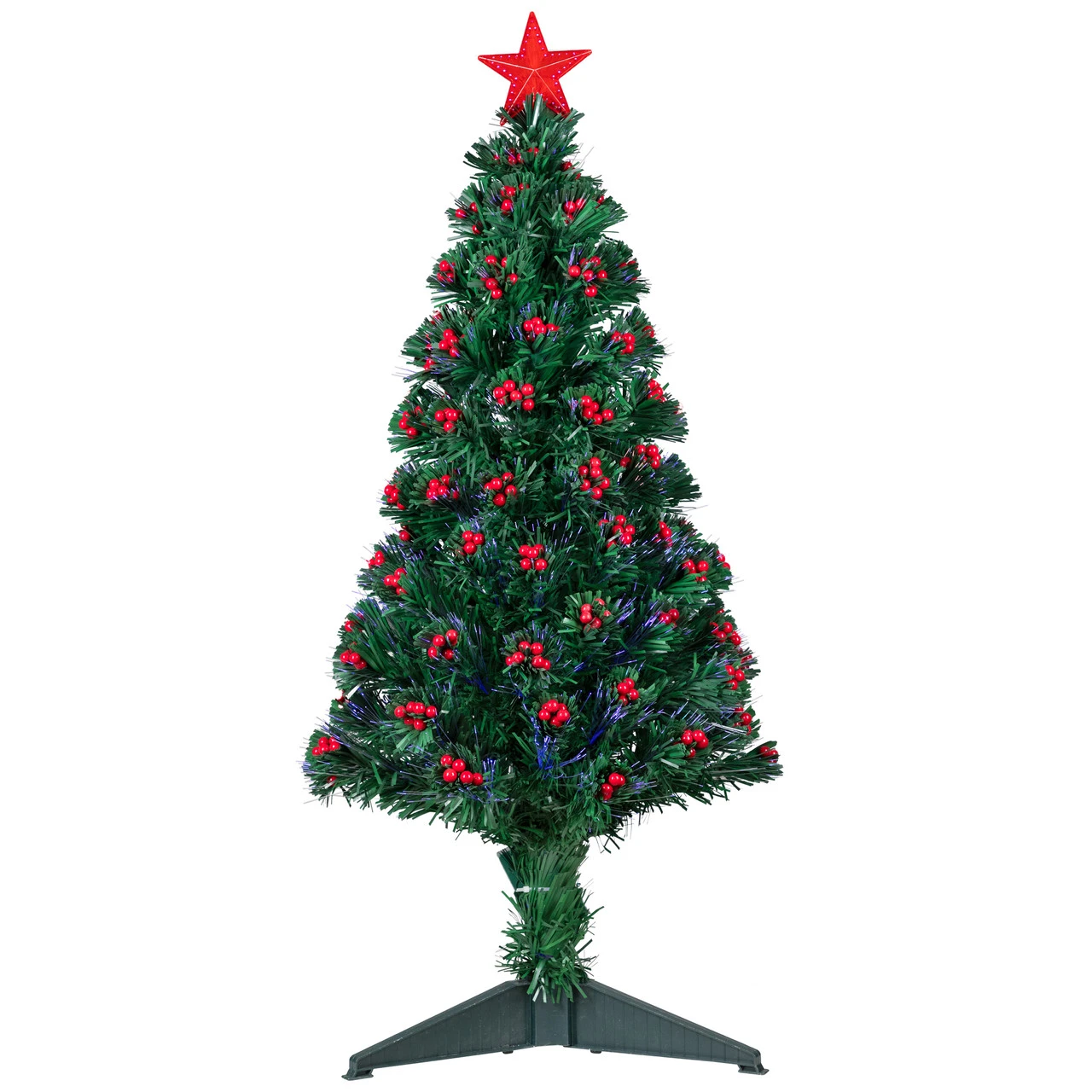 Pre-lit fiber optic tree has a multi-color wheel at base