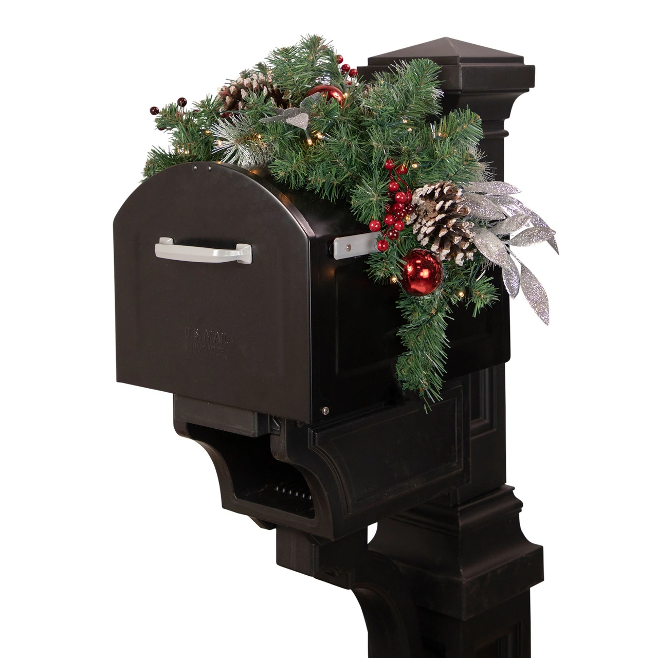 Accented with pine cones, glittered leaves, ball ornaments and red berries