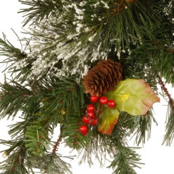 Features branches mixed with snow sprinkled bristle tips and is trimmed with red berries, pine cones, and holly leaves