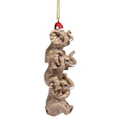 Ornament heralds the three truths of the man with elephant trunks lifted high for luck and a Santa hat