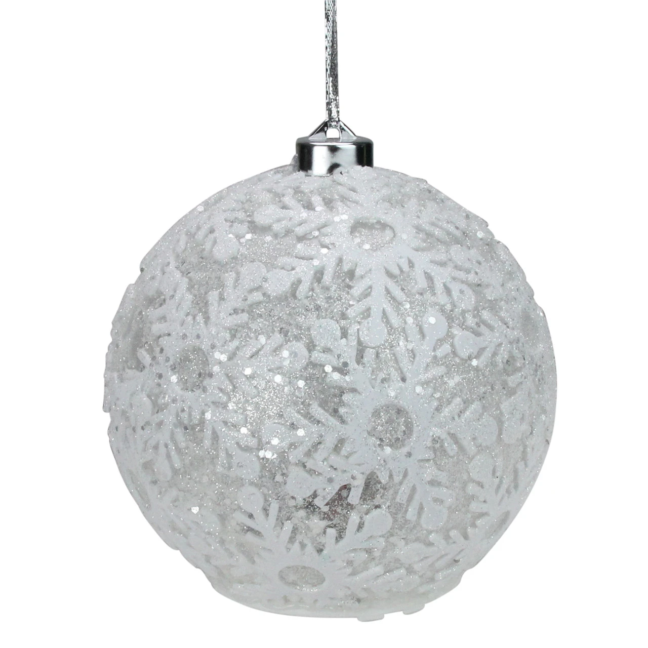 Snowflake design accented ornament; can be hung or set on a flat surface