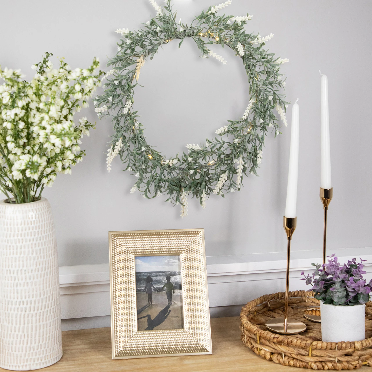 Artificial lighted lavender flower wreath