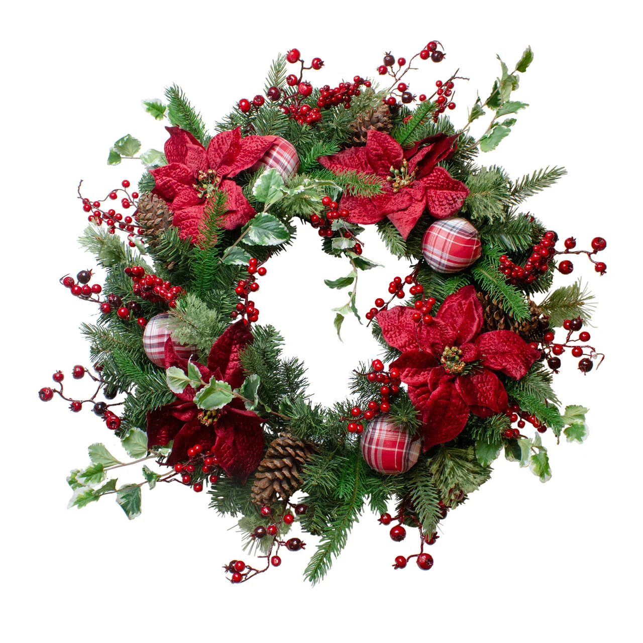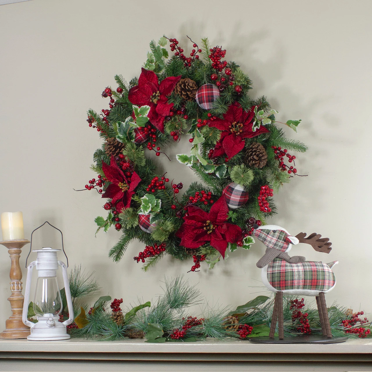 Accented with pinecones, berries and poinsettias