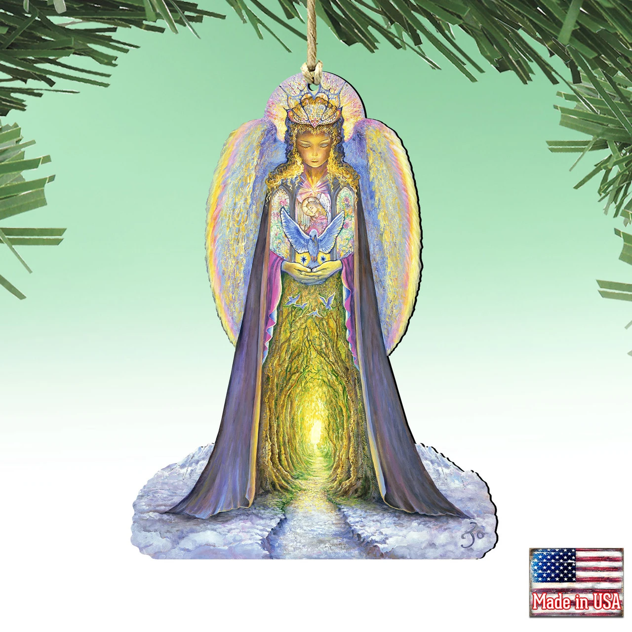 Ornaments depict an angel holding a bird with forest shown on its dress