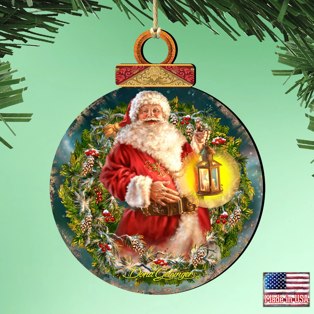 Ornaments has Santa Claus and a Christmas wreath