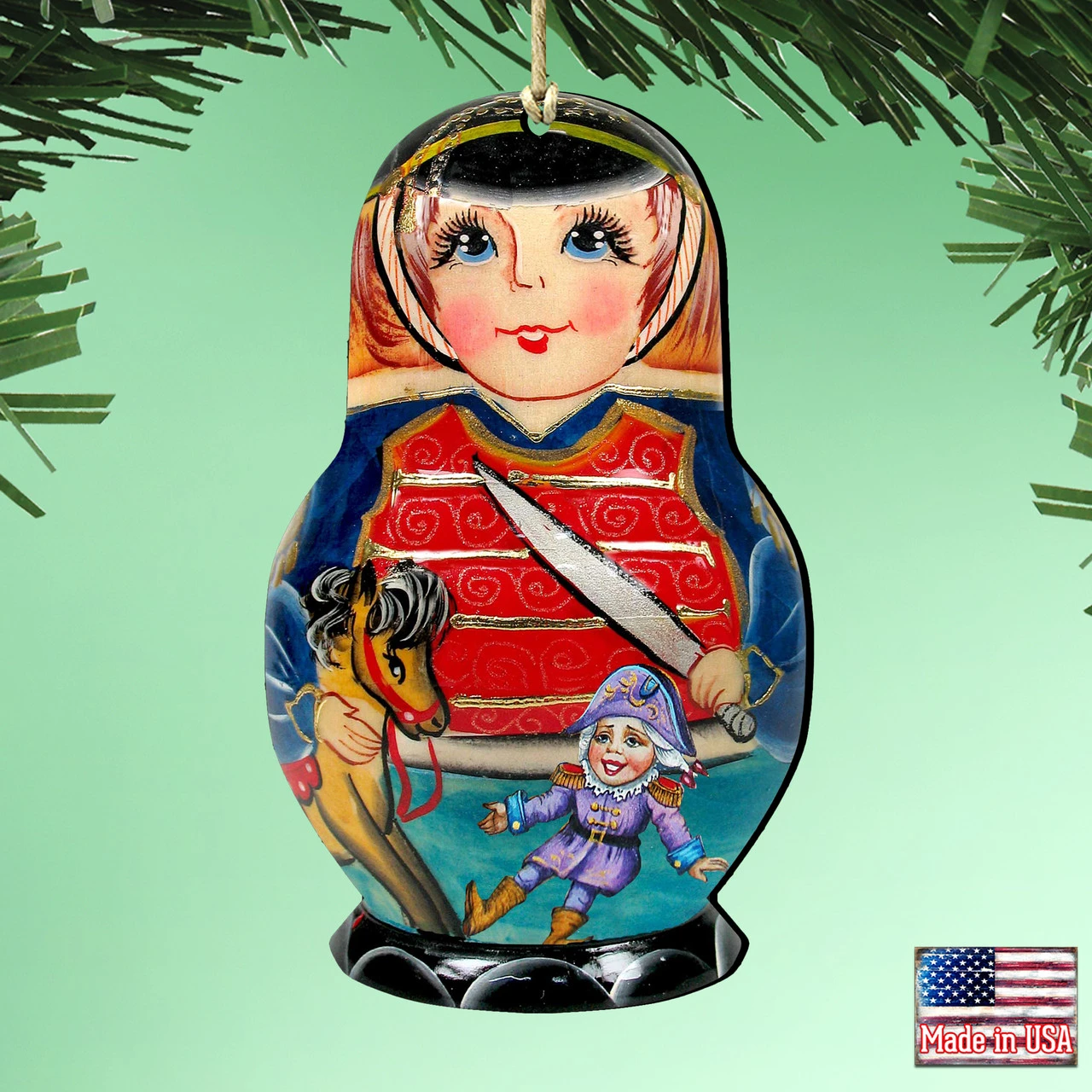 Ornaments depict a Matreshka doll nutcracker soldier holding a sword and a horse